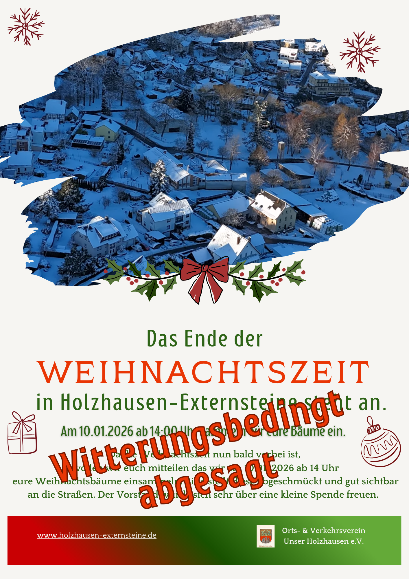 Aus gegebenen Witterungsbedingungen müssen wir das einsammeln der Weihnachtsbäume am 10.01. leider absagen. Wir hoffen für ihr Verständnis.